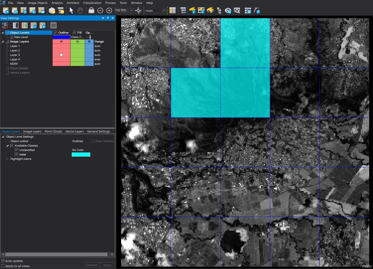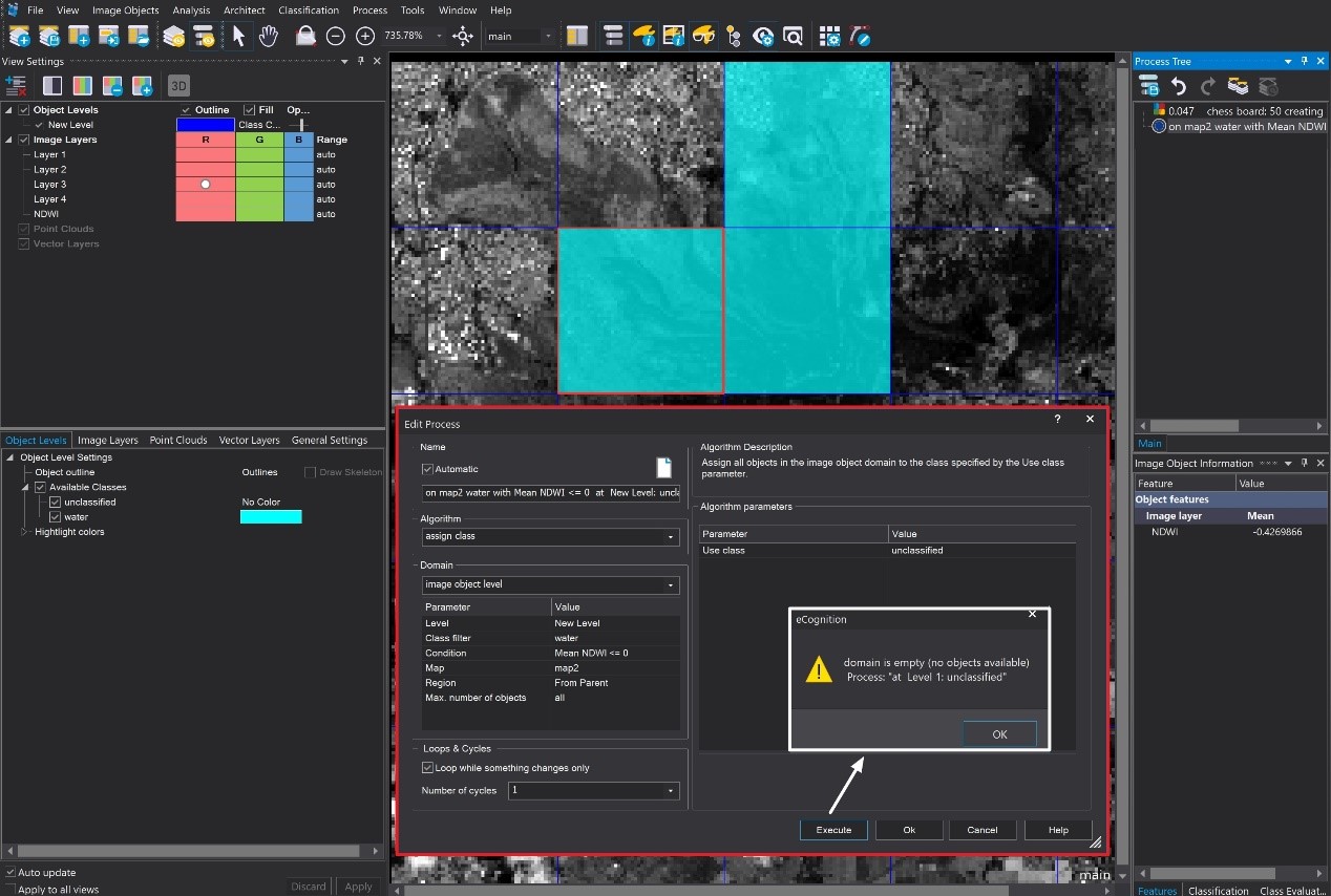是的!!!它只能是地图(Map)定义!首先,层(Level)是正确的(“New Level”)。我们在这一层确实有水体类“Water”,我们至少有一个对象(已选定的)也满足条件:Mean NDWI <=0(参见右侧的图像对象信息窗口(Image ObjectInformation window))。这意味着,其他参数之一一定是错误的,在这种情况下是地图(Map)定义。我们只有主地图Main,没有地图map2!