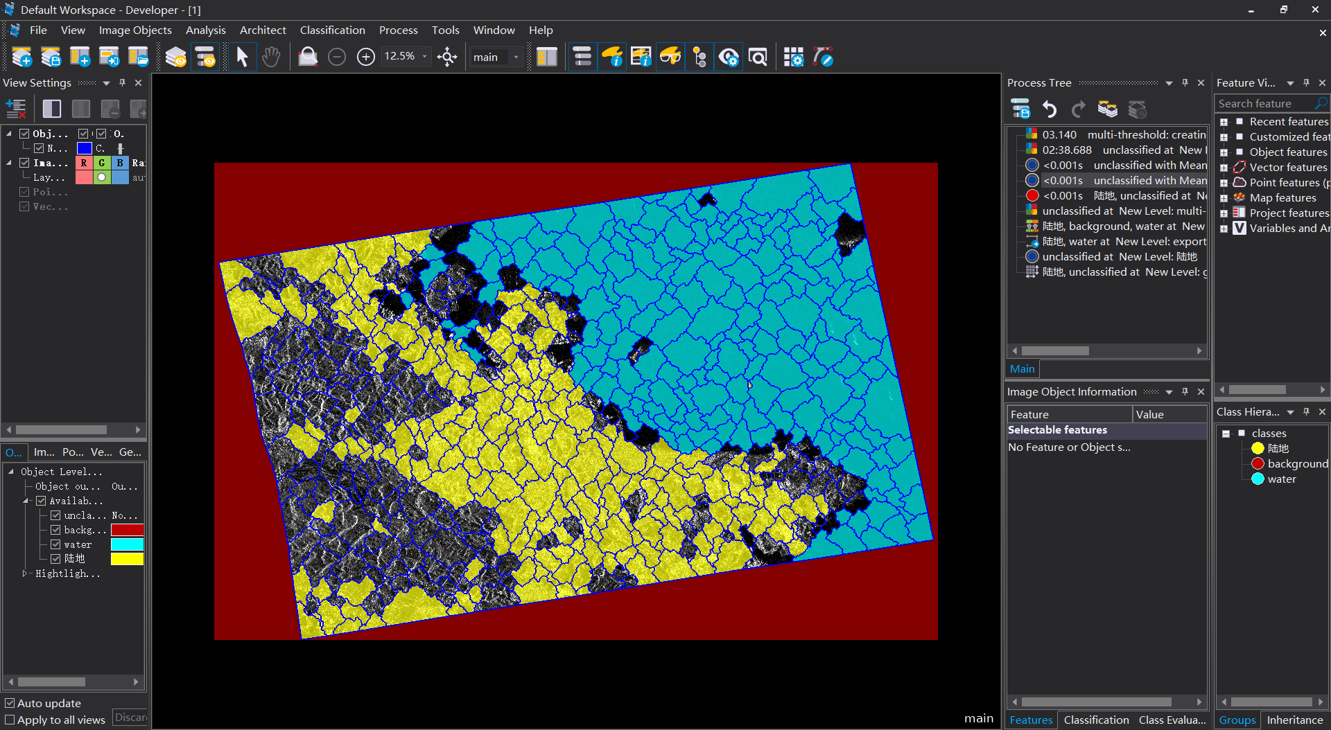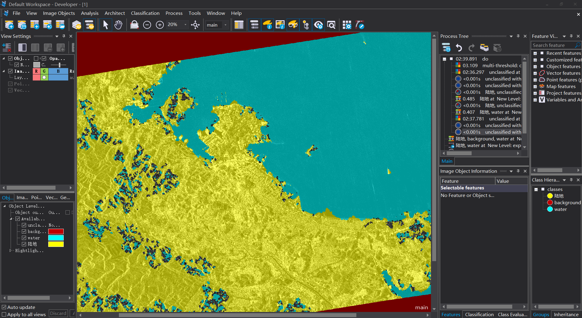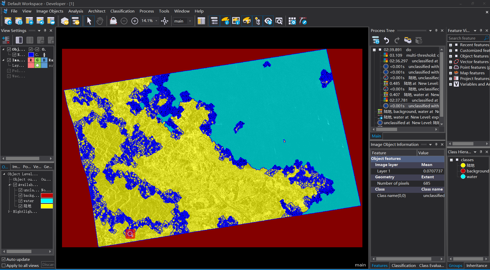 10 进行“陆地”和“水域”与“未分类”之间进行一个简单的分类去除;再将“陆地”中面积小于5000pixel的土块分到“水域”中/合并;将“水域”中面积小于5000的土块分到“陆地”中/合并