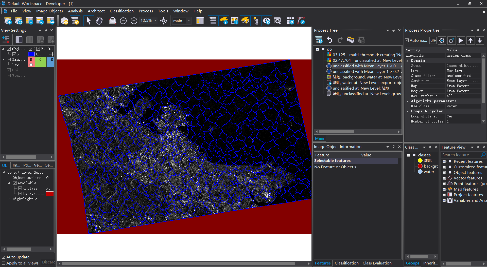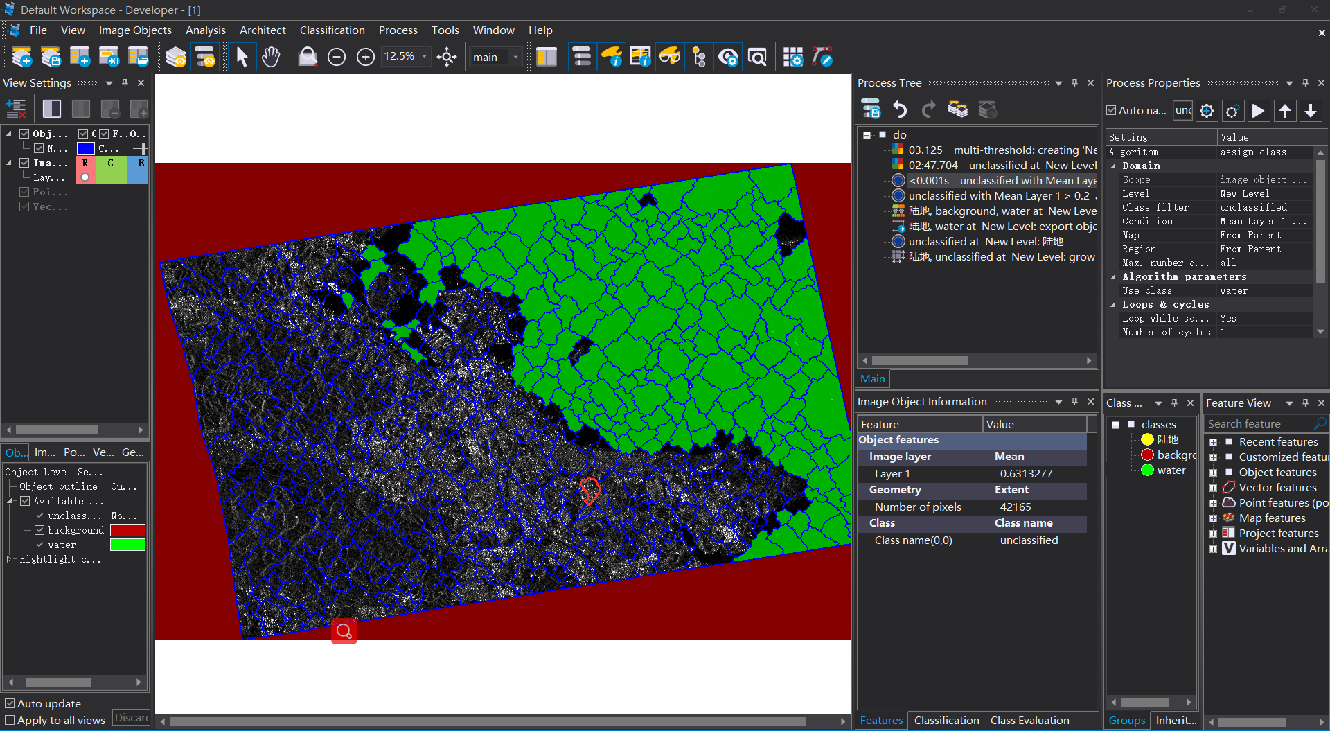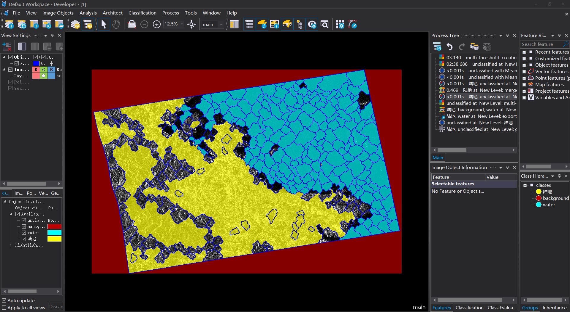 10 进行“陆地”和“水域”与“未分类”之间进行一个简单的分类去除;再将“陆地”中面积小于5000pixel的土块分到“水域”中/合并;将“水域”中面积小于5000的土块分到“陆地”中/合并